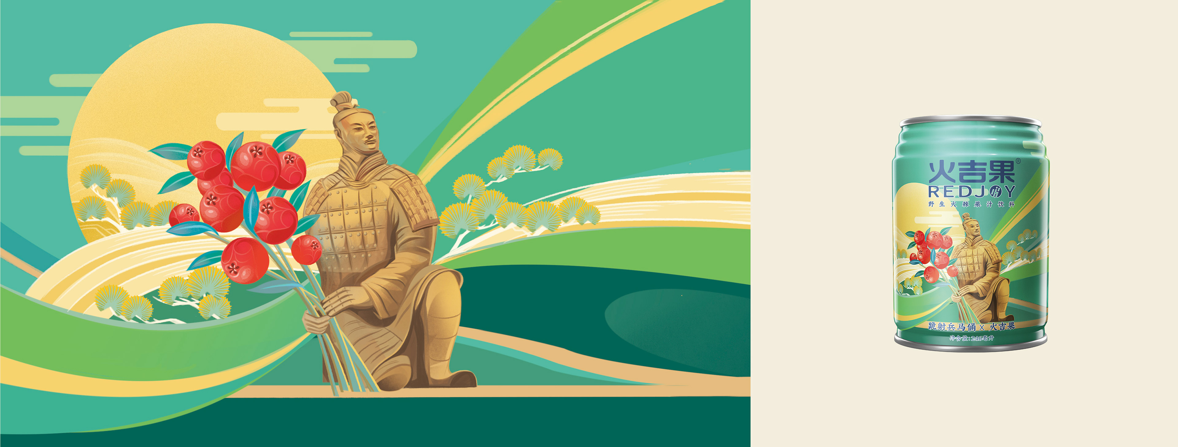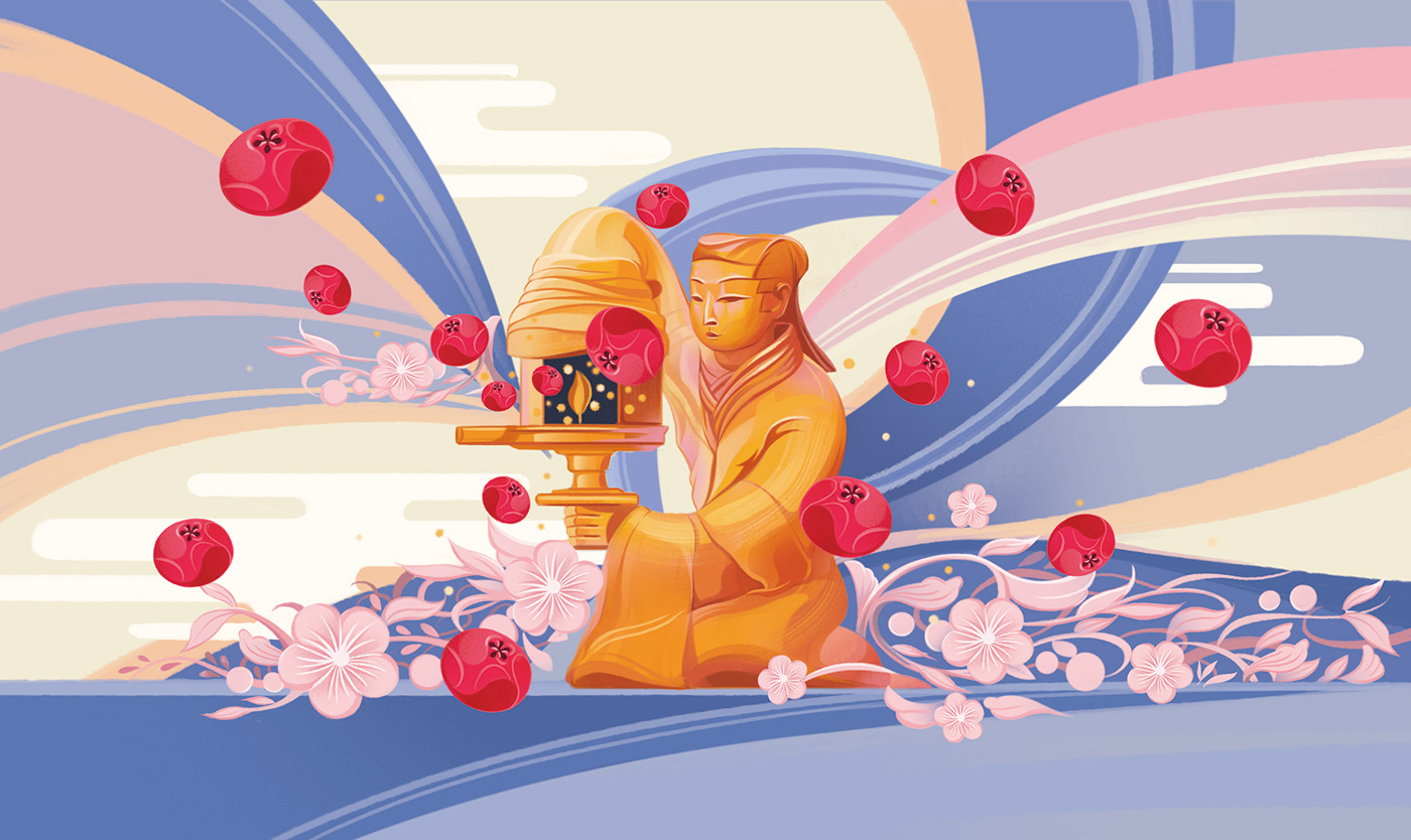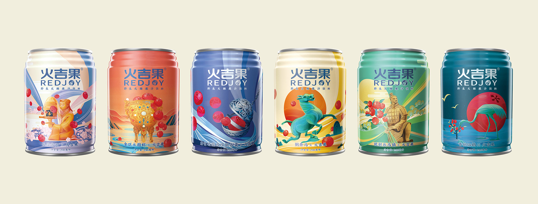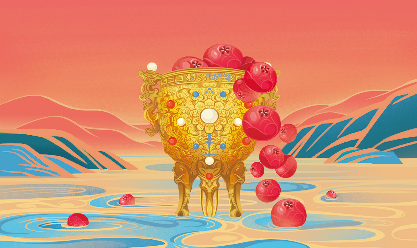 Protect the treasure people in the name of a national treasure. This is a charitable project commissioned by Tencent, "The Treasure People Project". I designed 6 different packagings combining Pyracantha crenatoserrata and national treasures, such as Changxin Palace lantern, Bronze Galloping Horse, and Terracotta Army. When designing the pictures, I used bold colors, smooth lines, and simple graphics to make the pictures more modern.
