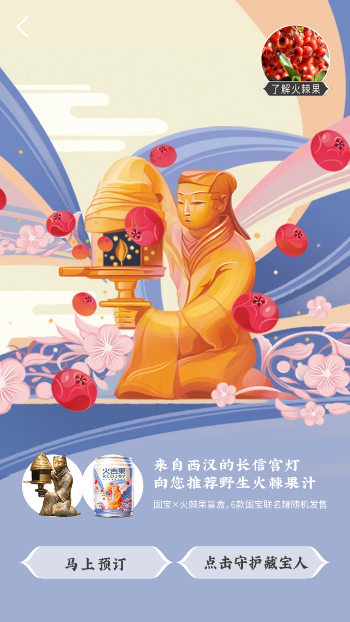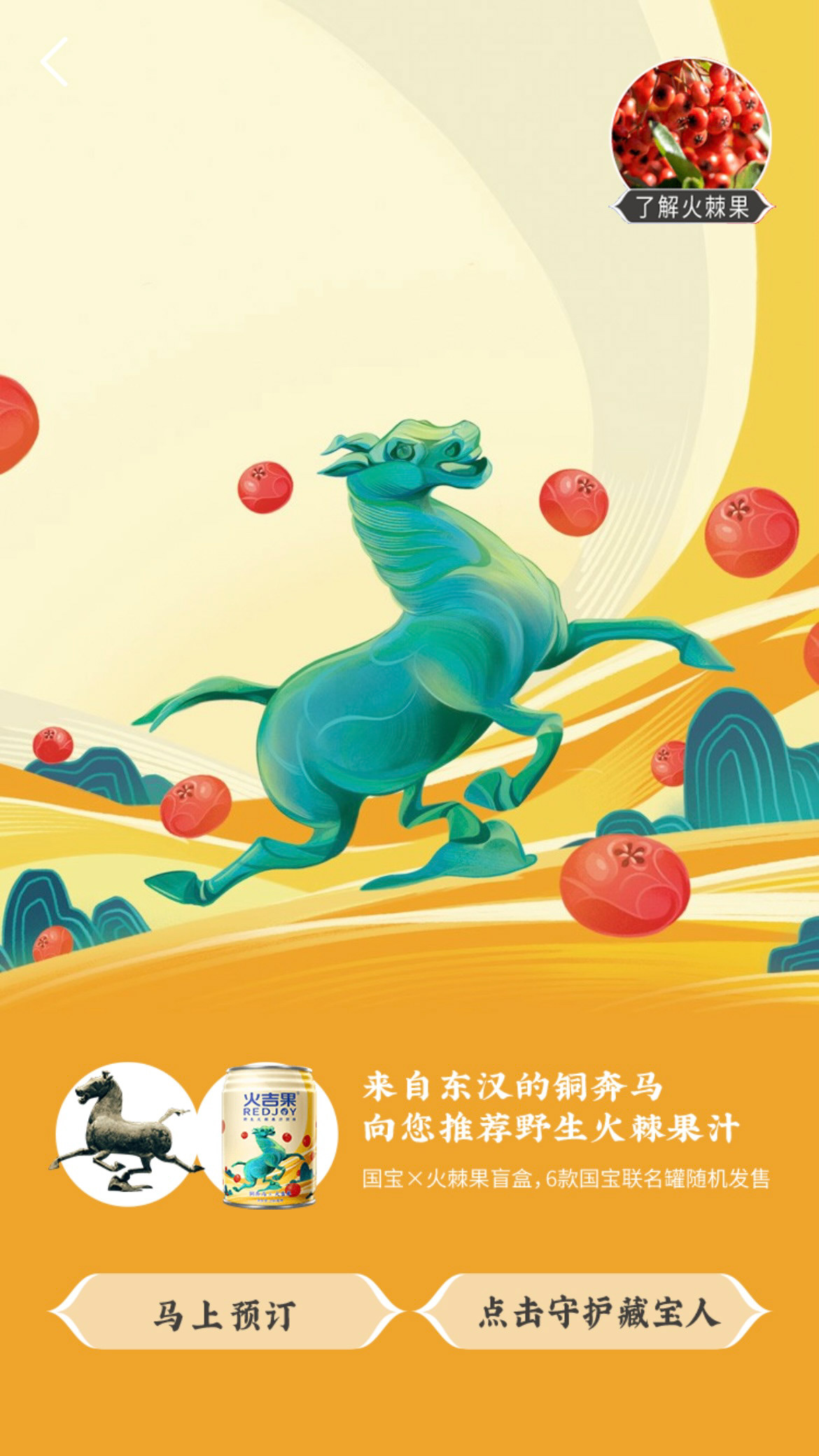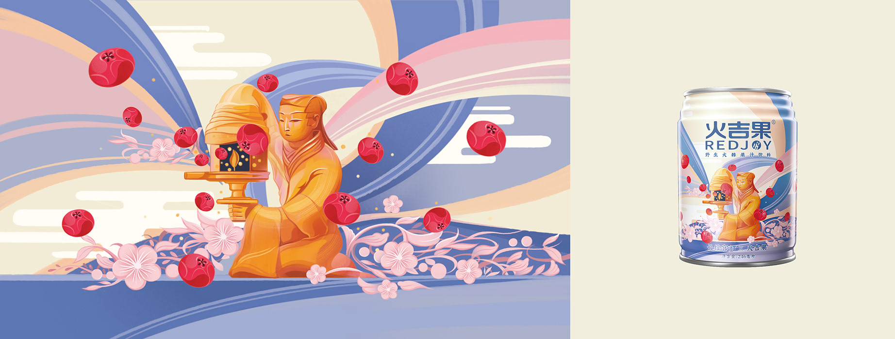 Protect the treasure people in the name of a national treasure. This is a charitable project commissioned by Tencent, "The Treasure People Project". I designed 6 different packagings combining Pyracantha crenatoserrata and national treasures, such as Changxin Palace lantern, Bronze Galloping Horse, and Terracotta Army. When designing the pictures, I used bold colors, smooth lines, and simple graphics to make the pictures more modern.